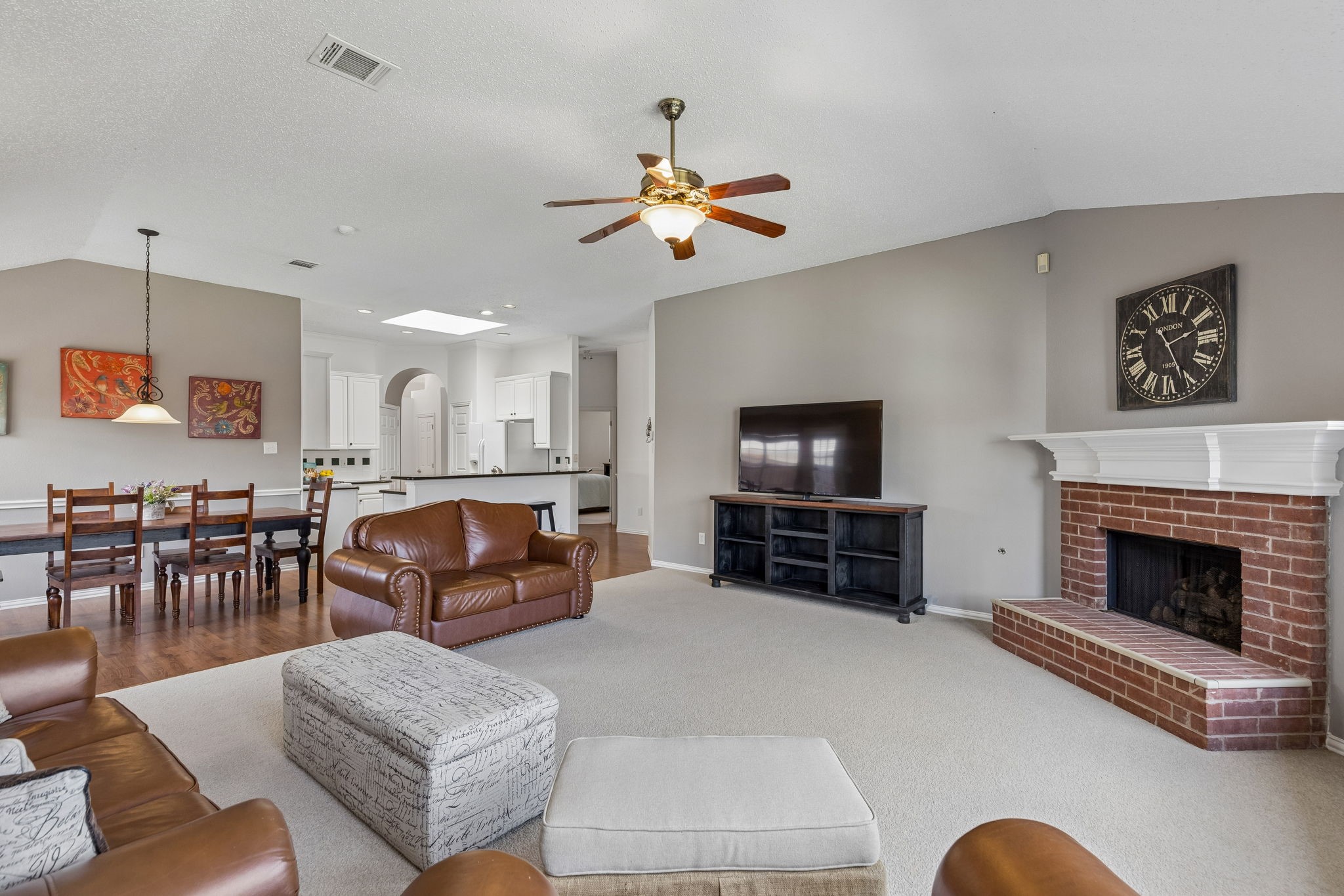 Tucked into a charming Lewisville neighborhood, 1217 Longhorn is a home that truly lives well. From the moment you walk in, this 3 bedroom home with an office creates the ideal floor plan. You'll notice the beautiful LVP wood floors that flow seamlessly through the space. The open floor plan allows entertaining with the kitchen open to an oversized breakfast space and living area. With granite counter tops and a gas range the kitchen is perfect for cooking and sharing a drink with a friend at the bar. The cozy gas fireplace creates the perfect gathering spot, while generous storage throughout keeps everything in its place. Out back, a handy storage shed adds even more flexibility--whether for weekend projects or everyday organization. Easy, comfortable living with all the right details. MULTIPLE OFFERS RECEIVED. HIGHEST AND BEST BY NOON, MARCH 27TH.