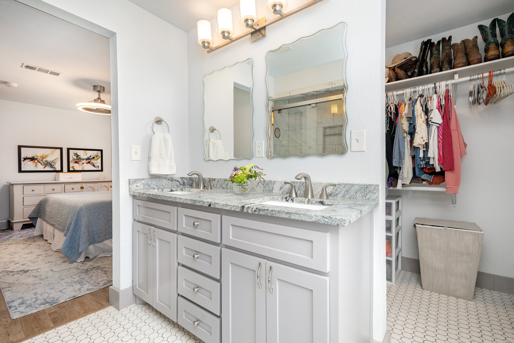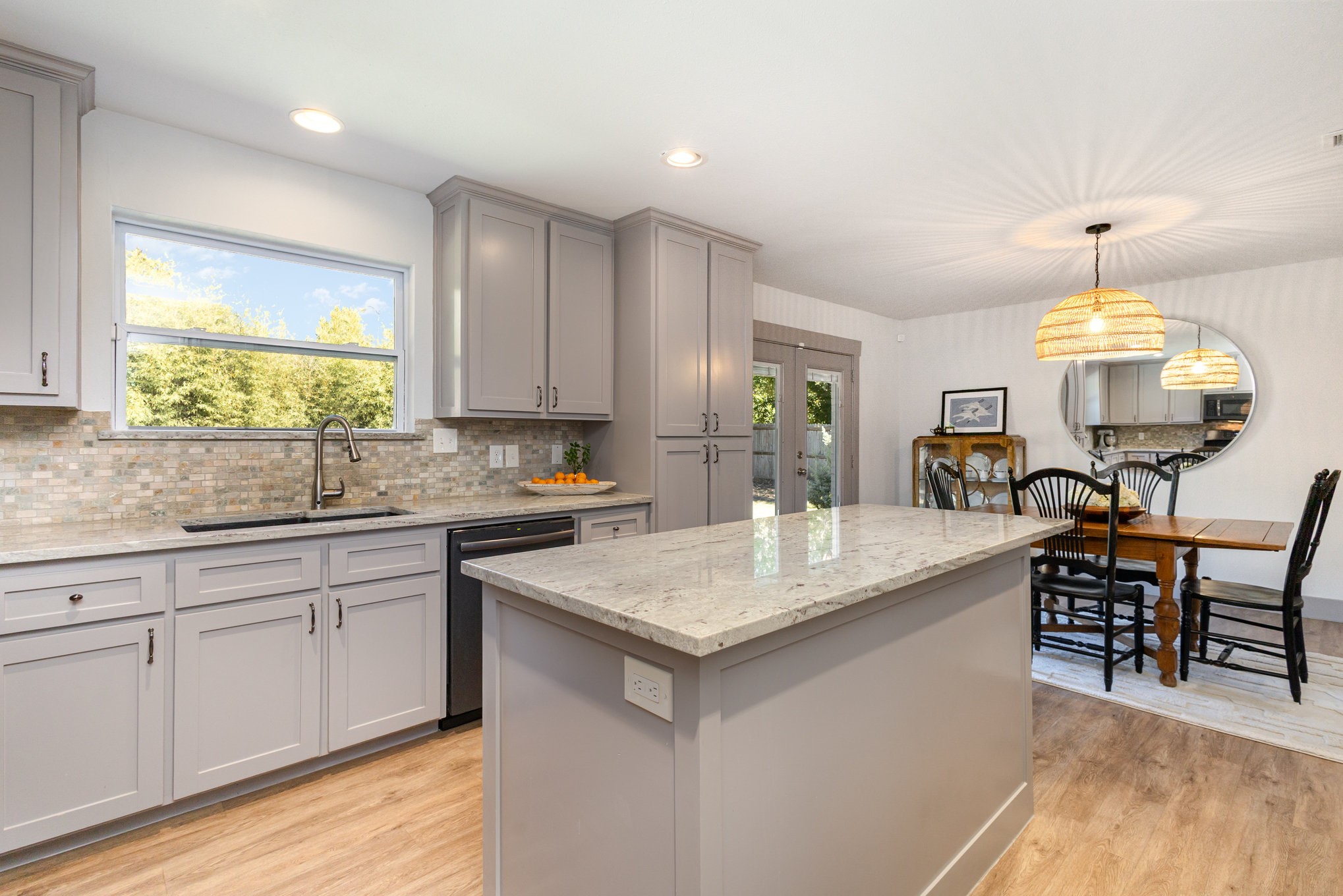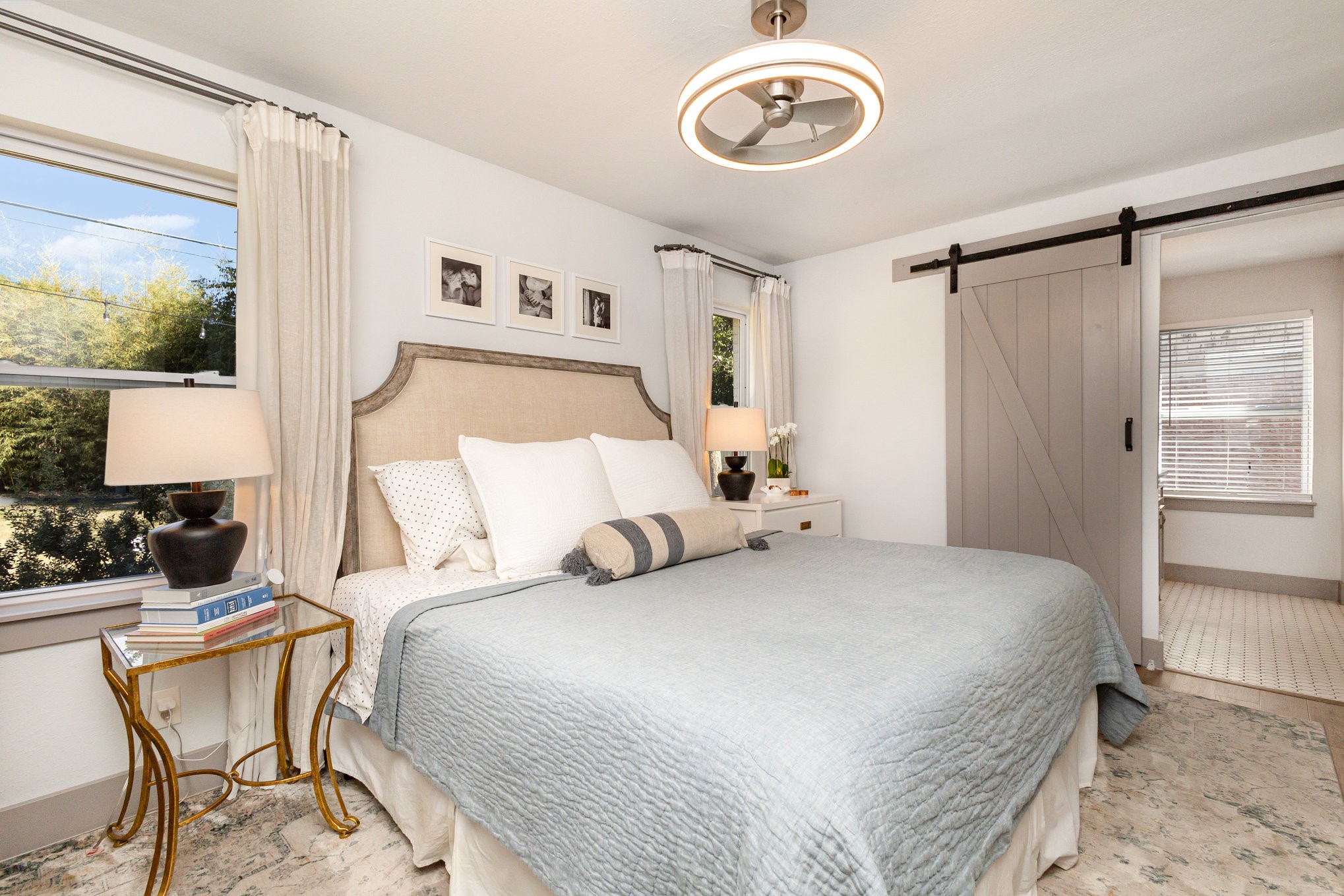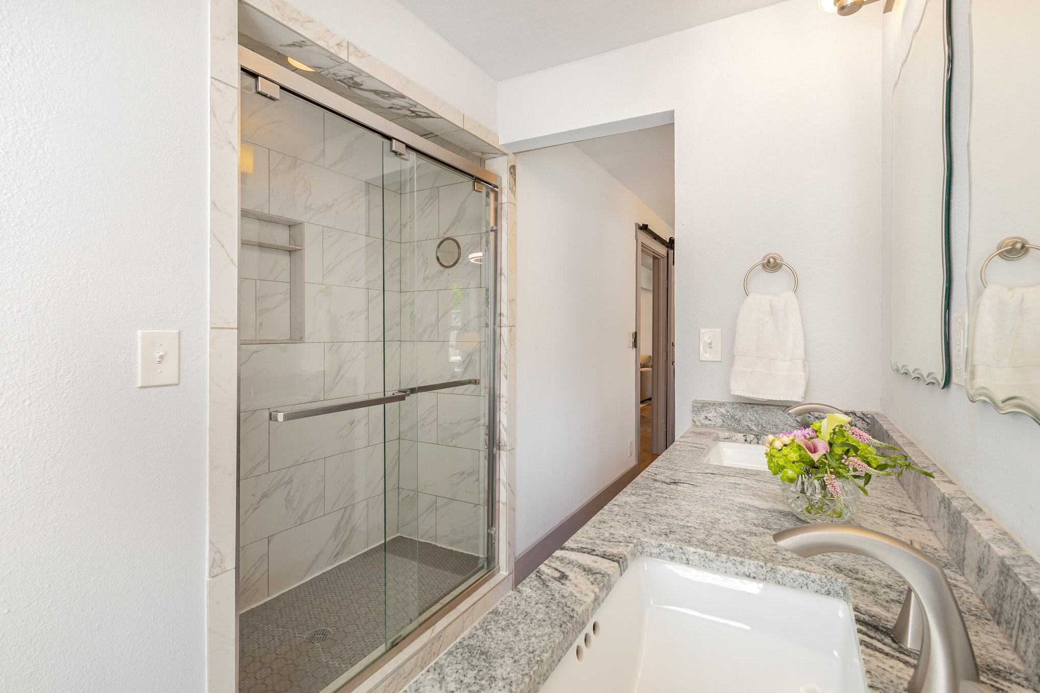 The updated kitchen features custom gray cabinetry, a decorative stone backsplash, and a sliding barn door that opens to a spacious walk-in pantry and utility area, offering both form and function. The primary suite serves as a relaxing retreat with sliding barn doors, dual vanities, octagon tile flooring, and a large walk-in shower. Each space in the home has been well cared for, reflecting excellent upkeep and pride of ownership throughout.