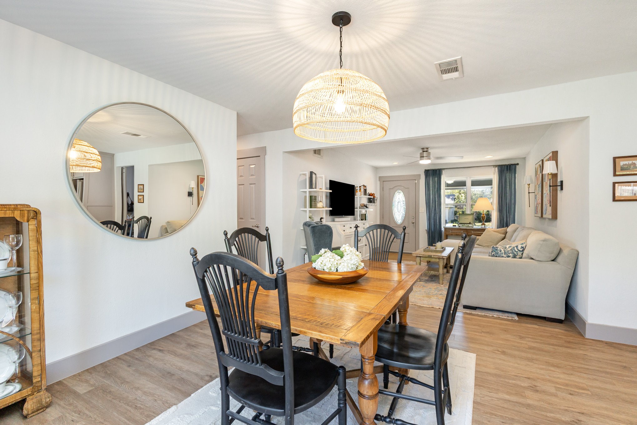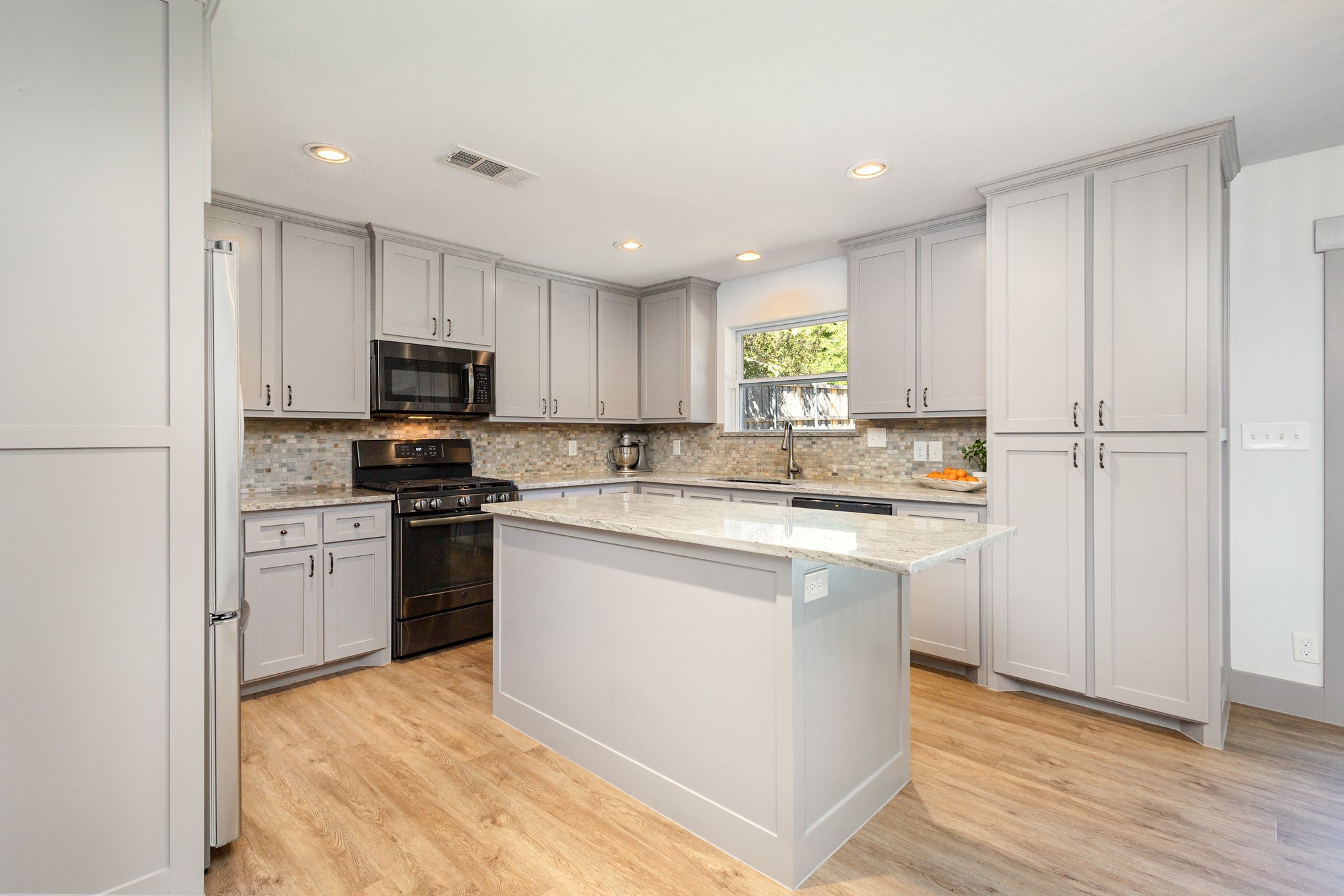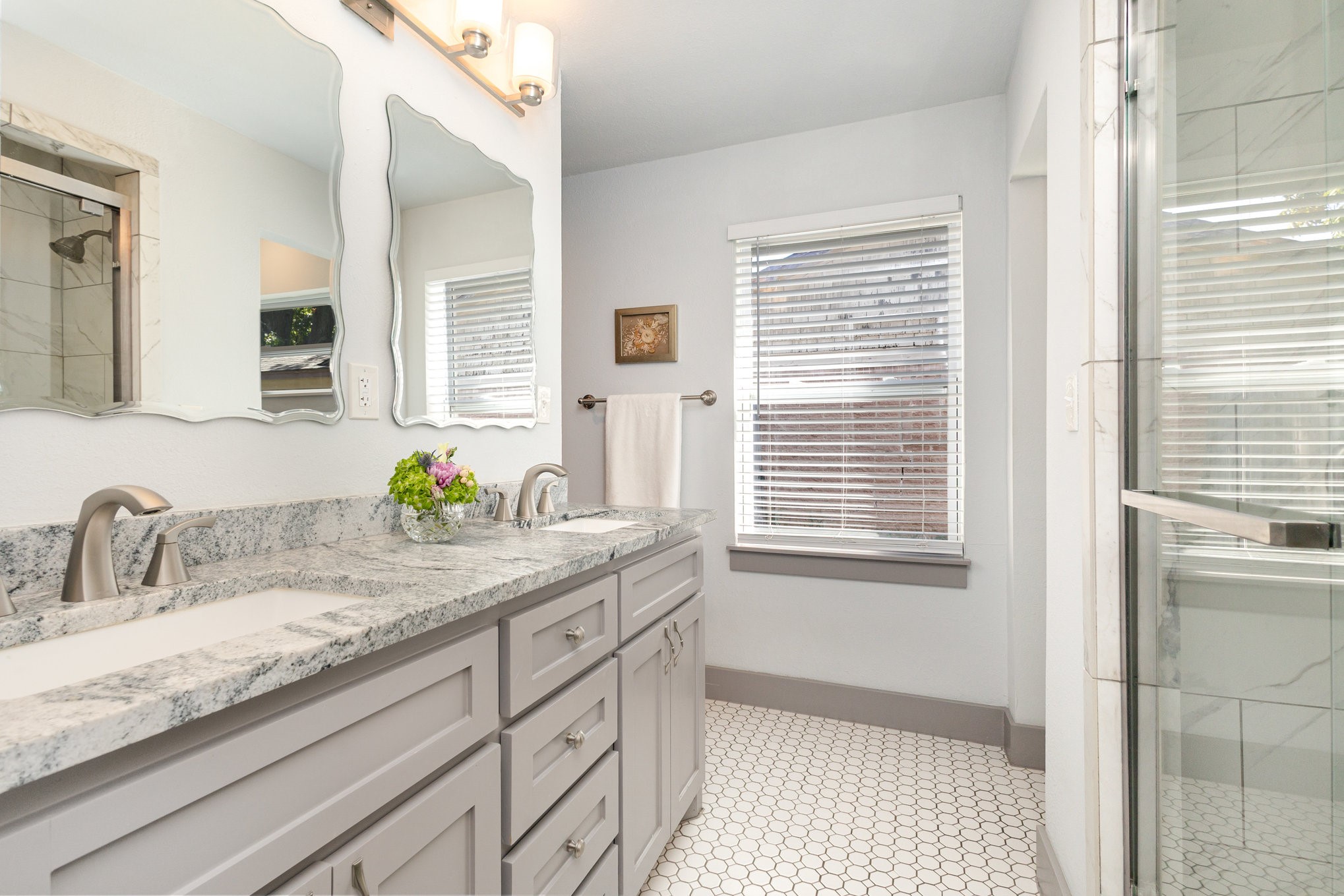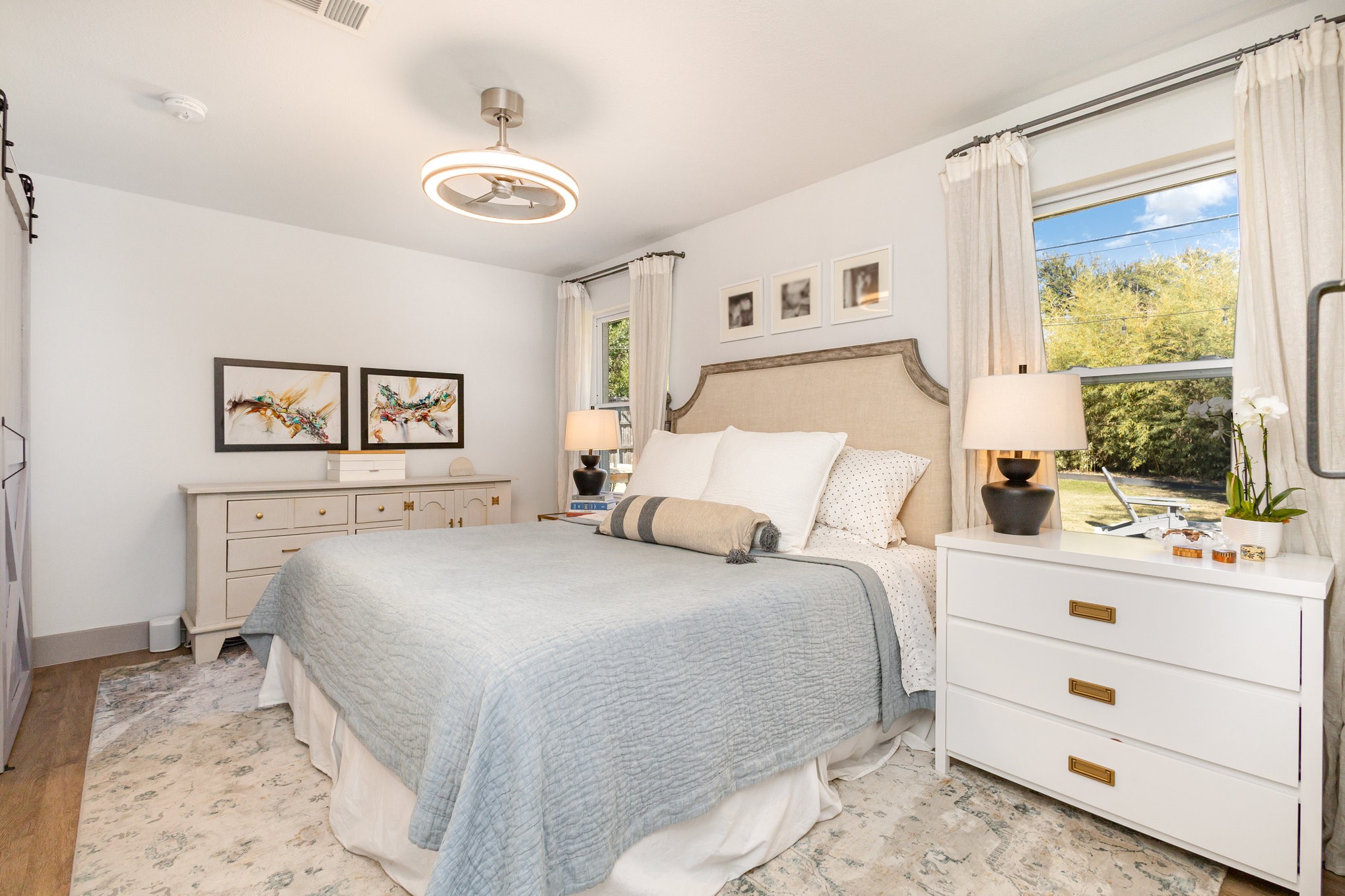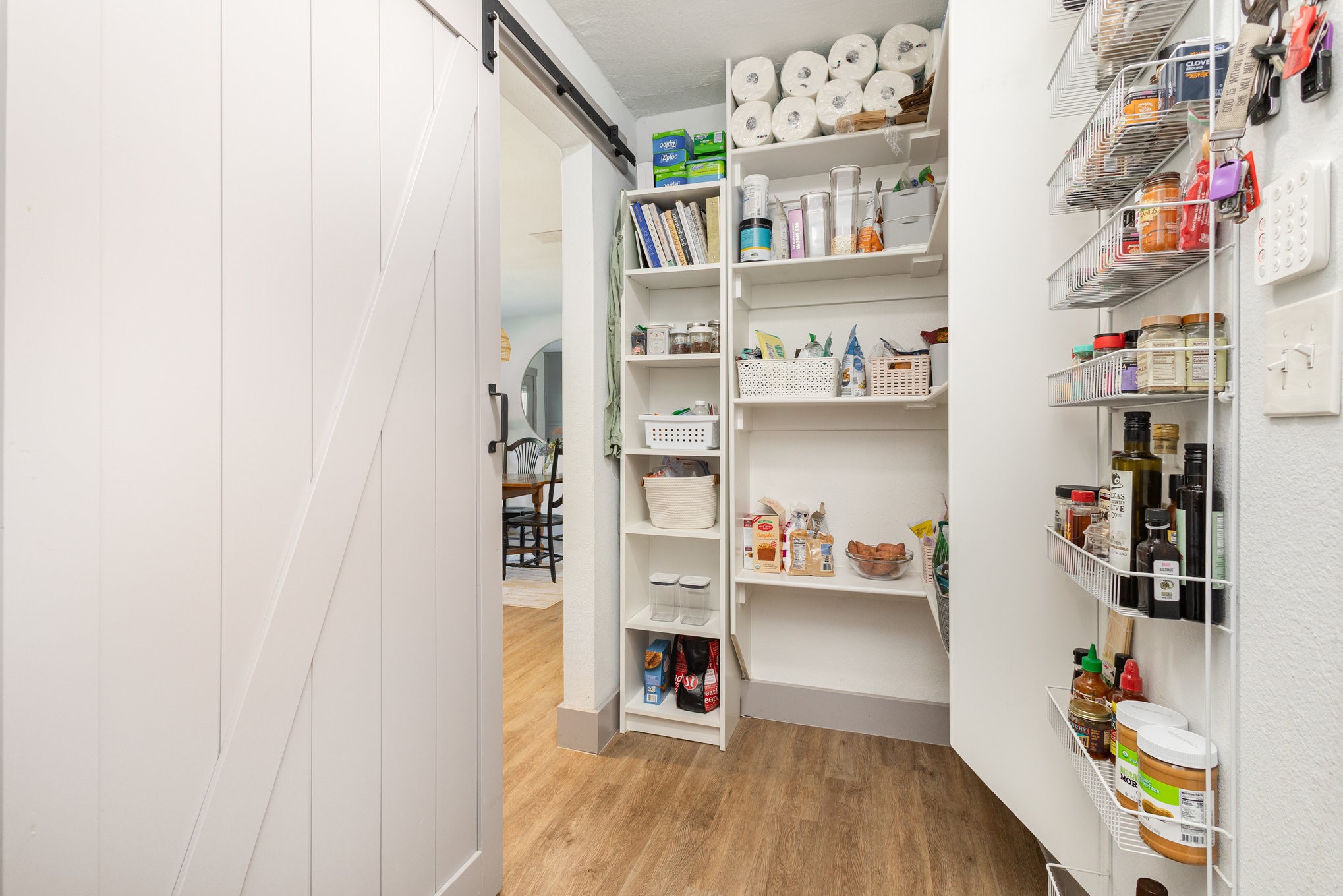 The updated kitchen features custom gray cabinetry, a decorative stone backsplash, and a sliding barn door that opens to a spacious walk-in pantry and utility area, offering both form and function. The primary suite serves as a relaxing retreat with sliding barn doors, dual vanities, octagon tile flooring, and a large walk-in shower. Each space in the home has been well cared for, reflecting excellent upkeep and pride of ownership throughout.