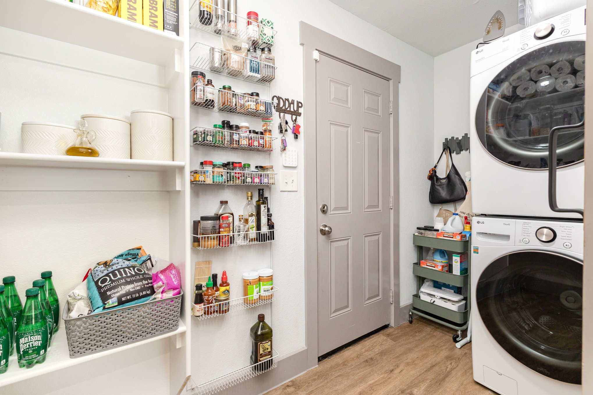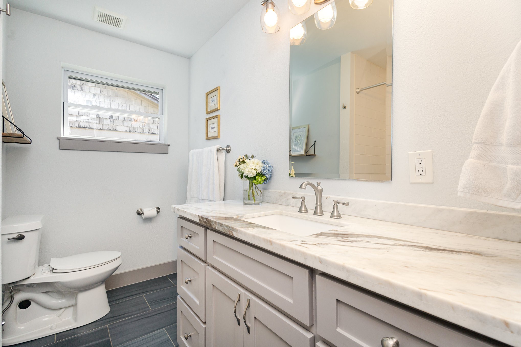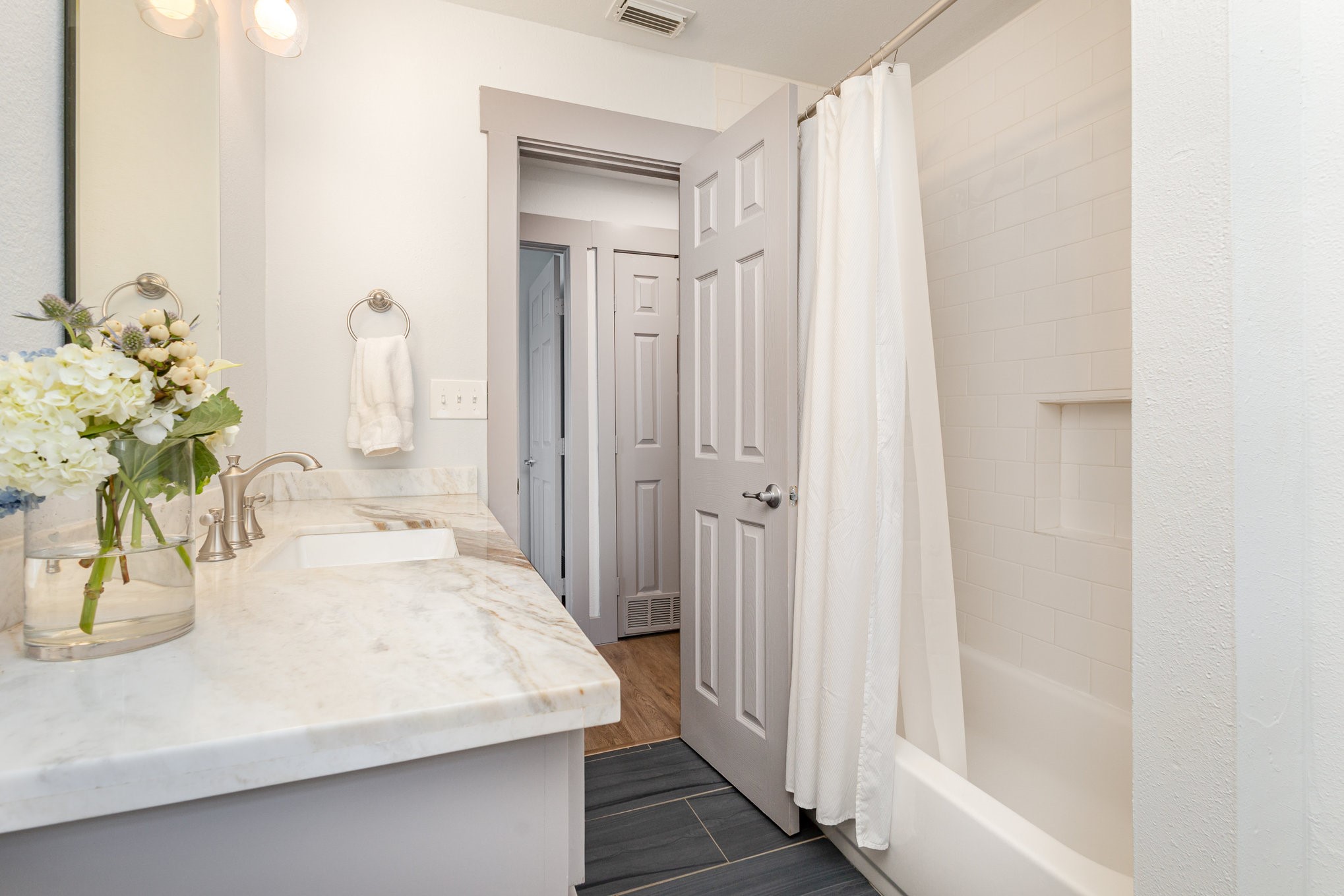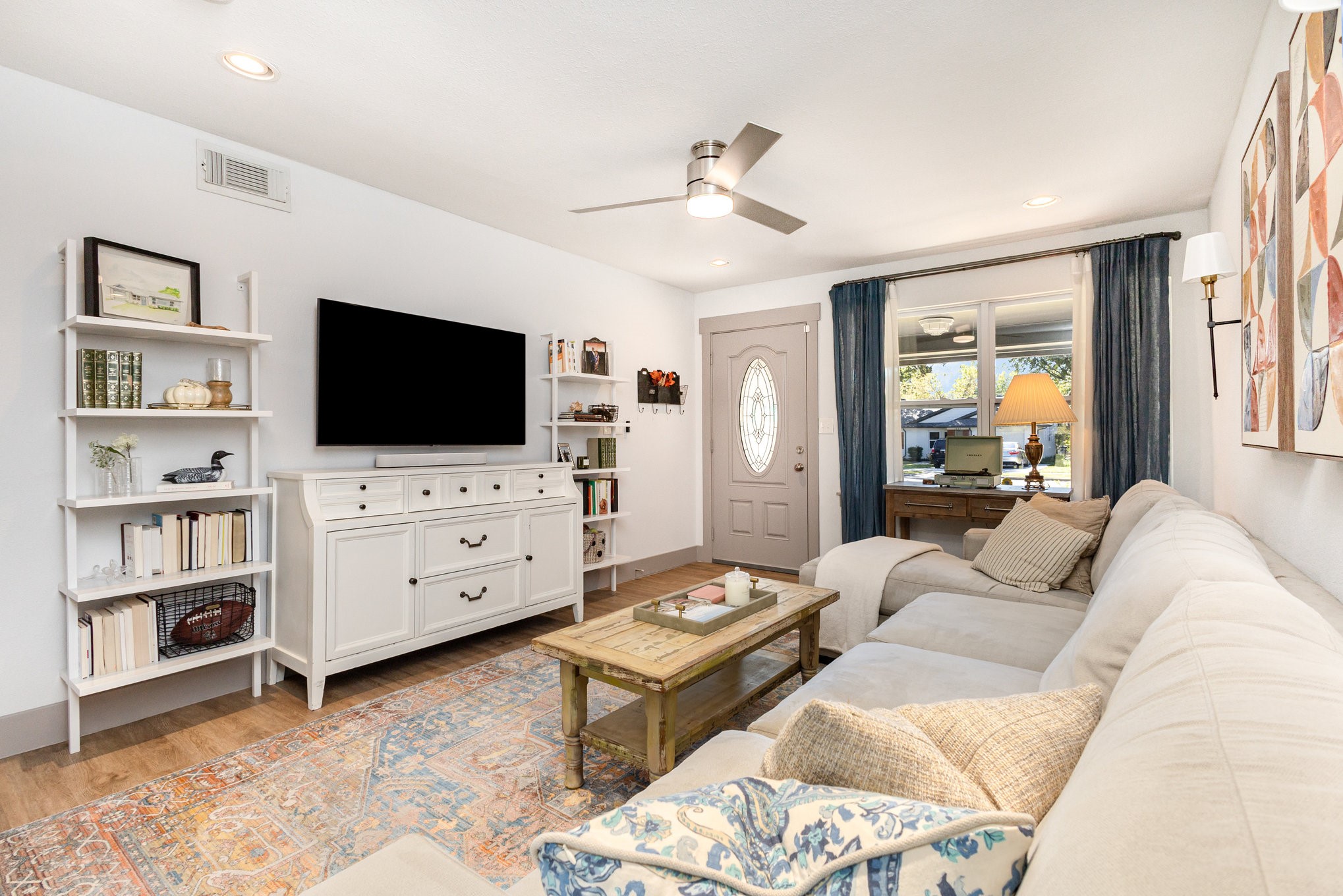 The updated kitchen features custom gray cabinetry, a decorative stone backsplash, and a sliding barn door that opens to a spacious walk-in pantry and utility area, offering both form and function. The primary suite serves as a relaxing retreat with sliding barn doors, dual vanities, octagon tile flooring, and a large walk-in shower. Each space in the home has been well cared for, reflecting excellent upkeep and pride of ownership throughout.