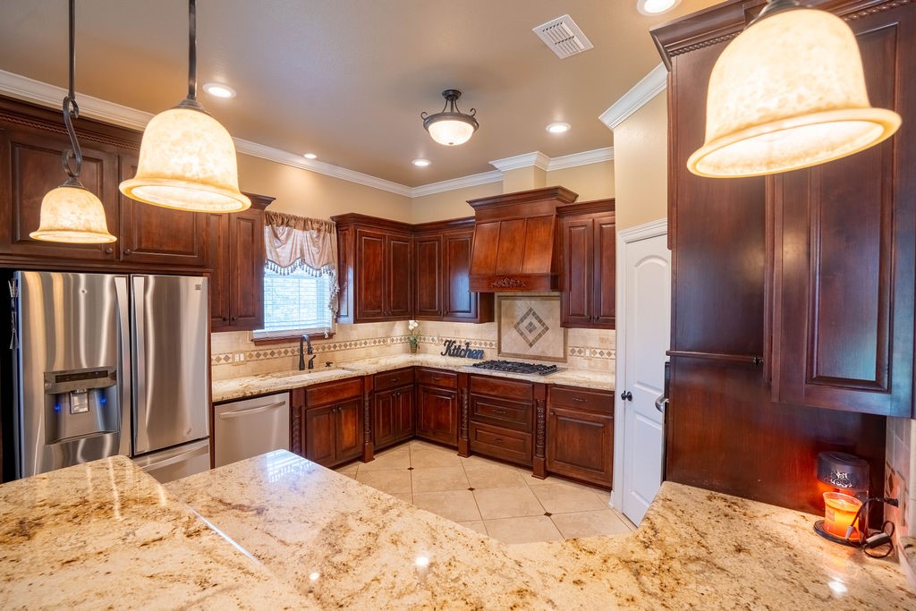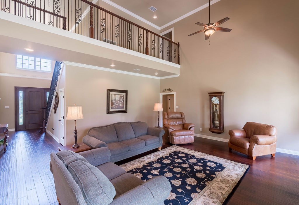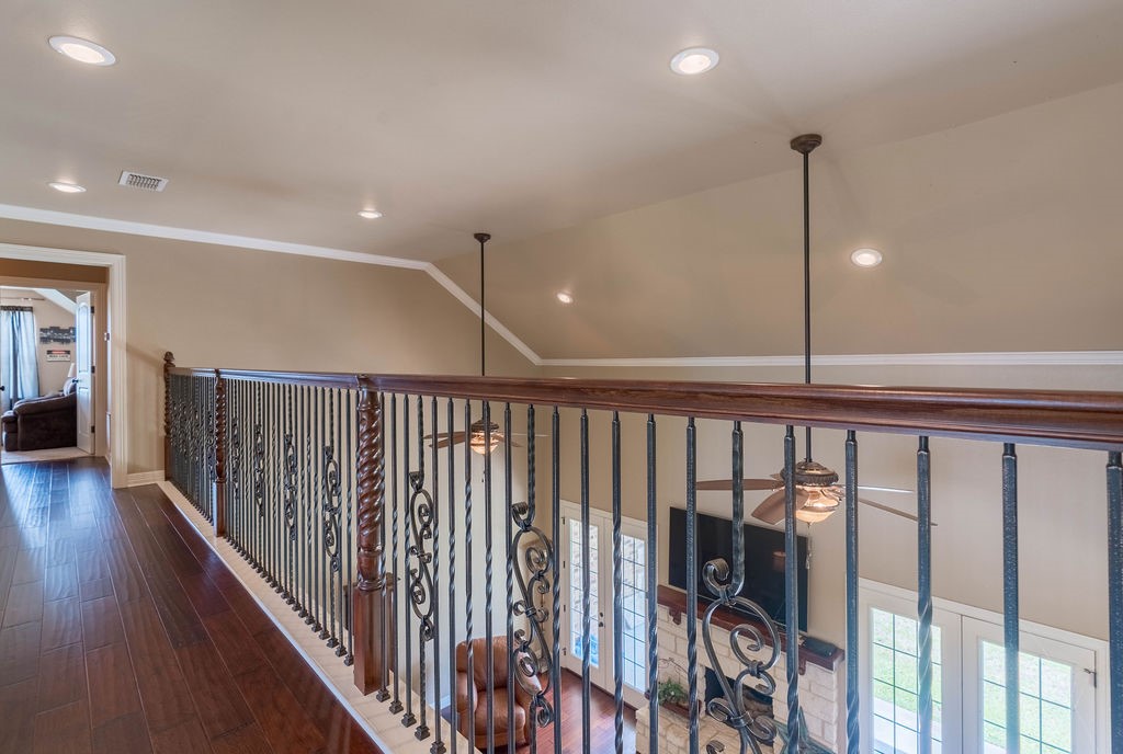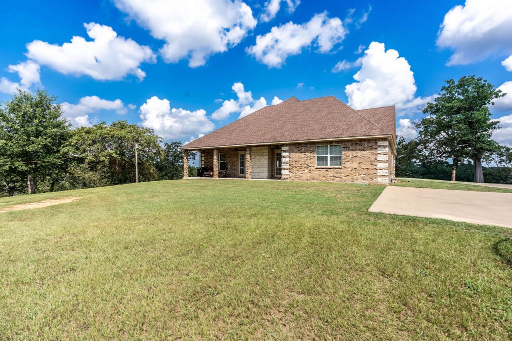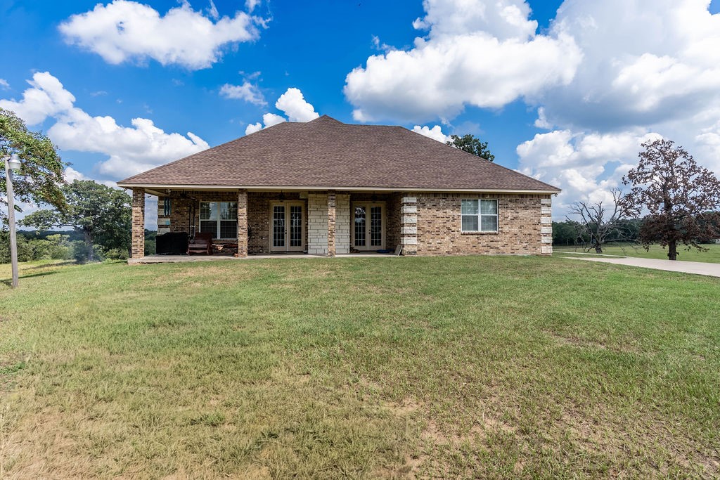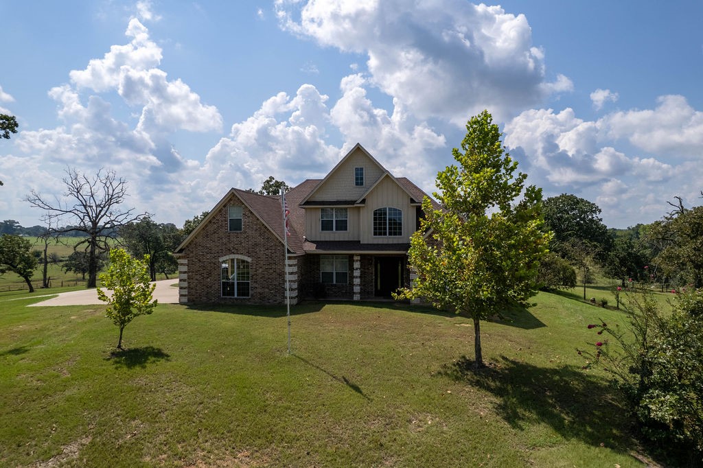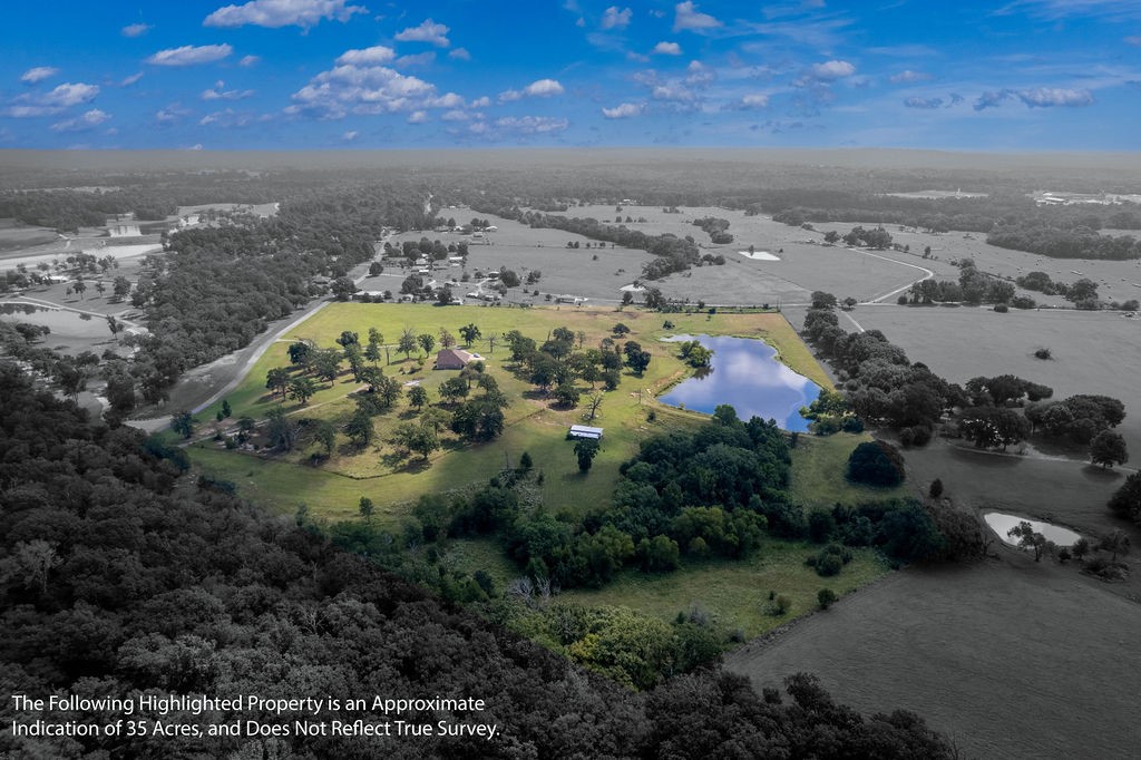 Stunning home on 35 acres with large, stocked pond! This custom Middleton built home sits beautifully atop a hill, offering breathtaking views of the surrounding landscape. Enter the property grounds through a solar powered gate as the asphalt driveway leads to ample concrete-padded parking and an oversized 2 car garage. The entire property is fenced making it ideal for livestock and outdoor activities. The large pond is stocked with wide mouth bass, perch, and channel catfish. Inside the home you will find spacious living with an open concept and thoughtfully designed floorplan. The living area boasts french doors which lead to the back patio, a stone gas fireplace and a soaring ceiling with the upstairs balcony being a beautiful focal point. The gourmet kitchen flaunty custom-built cabinetry, a wall in pantry, granite countertops, an oversized bar, stainless appliances, a gas cooktop and separate oven, and undermount lighting adding stunning ambiance. The large primary bedroom is on the main level and offers an ensuite bathroom with jacuzzi tub, separate shower, private water closet, dual sinks, and a generously sized walk-in closet with built ins. There is also another bedroom and full bath on the main level that would be ideal for guests. Two secondary bedrooms, a flex room, and a full bath are located upstairs along with LOTS of priceless storage space. Crown molding throughout, pocket doors for the office space, elegant wrought iron stair railing, large windows and wood & stone accents are just a few custom details that add unique charm to this home, but the 360-degree view that this property offers will leave you absolutely speechless!